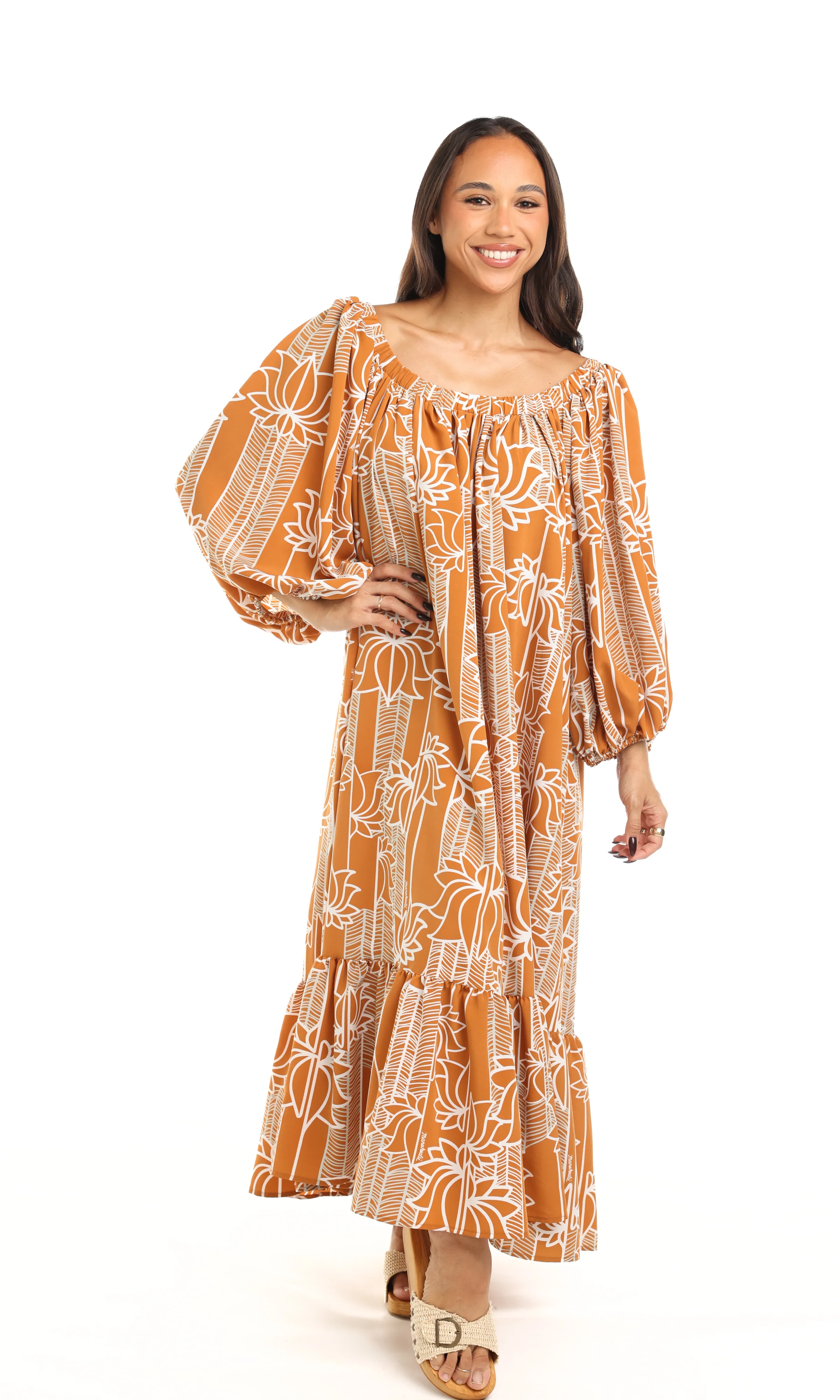 Voluminous and versatile elastic neckline Muʻu that can be worn on or off shoulders. Finished with puff sleeves, long ruffle, and pockets.